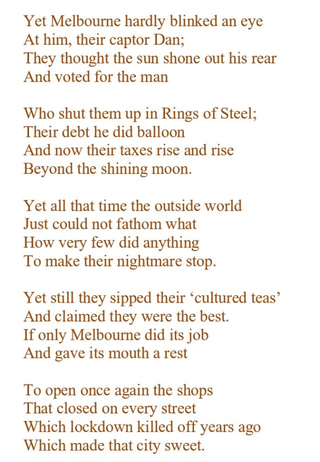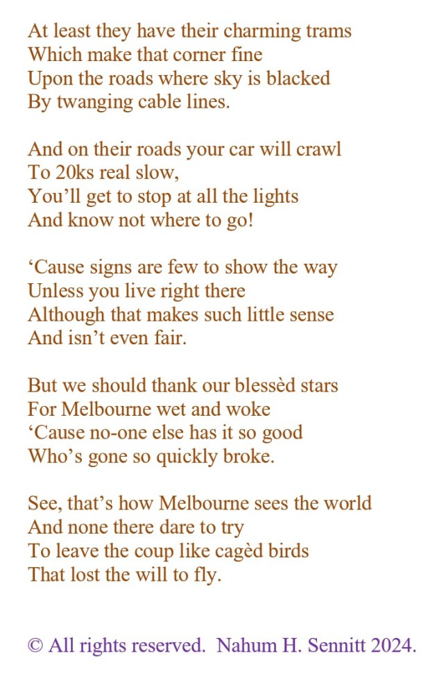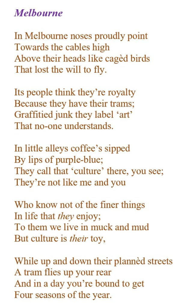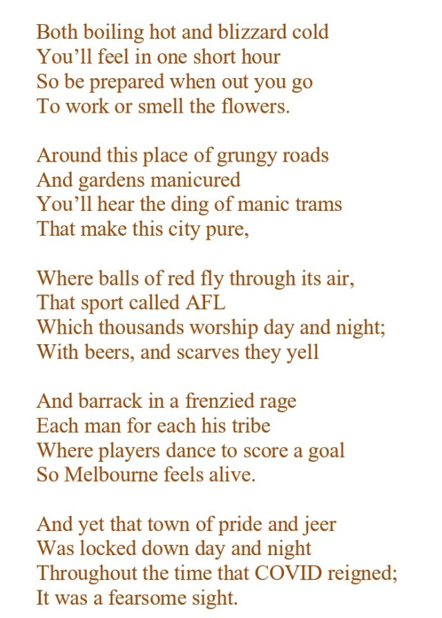 Since I wrote an earlier poem about Sydney, I thought I would try one about another Australian city that wishes it was Sydney: Melbourne, the capital of Victoria. I have written it in the form of a ballad with an 8-6-8-6 rhyming scheme of 20 verses. Enjoy! (PS – In the 17th stanza, ’20ks’ is meant to be said as ‘twenty kays’. It is Australian slang for 20 kilometres an hour; this is the equivalent of driving at 12 miles per hour.)