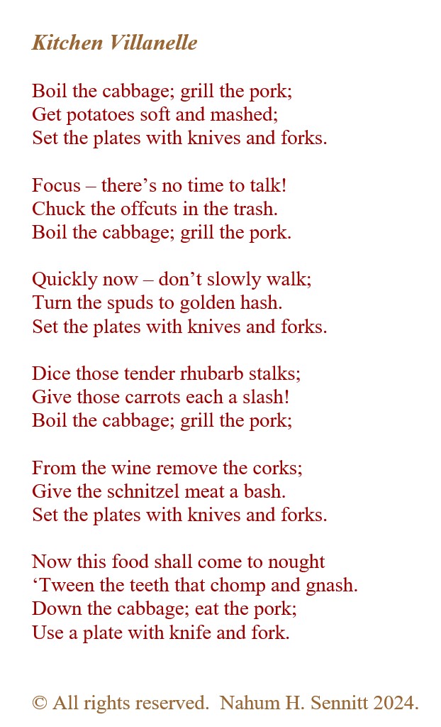 This is a poem in the form of a villanelle that I wrote today about kitchens! It is written in the form of a villanelle, where the first and third lines of the poem are repeated three times throughout. Enjoy. Nahum.