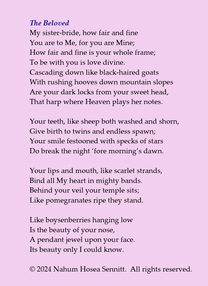 For the last 1.5 years I have committed the Old Testament book of The Song of Solomon to English poetic verse; I named it “Walking with Jesus in the Garden: Amazing Grace in The Song of Solomon”. The Song celebrates an ideal marriage between King Solomon (named Dodi, or The Beloved) and his bride, the Shulamite. The Song is fulfilled in Christ, who is the Beloved as He loves His bride, the Church. The sample passage here is based on 4:1-3.