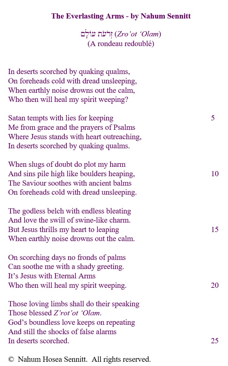 Here is a poem that I wrote about three years ago, about the everlasting arms of Jesus as a comfort to His flock. It is based on the Hebrew word zro’ot olam, which means ‘everlasting arms’; the phrase originates from Deuteronomy 33:26-28, which says, The eternal God is your dwelling place, and underneath are the everlasting arms. May this poem bless you.