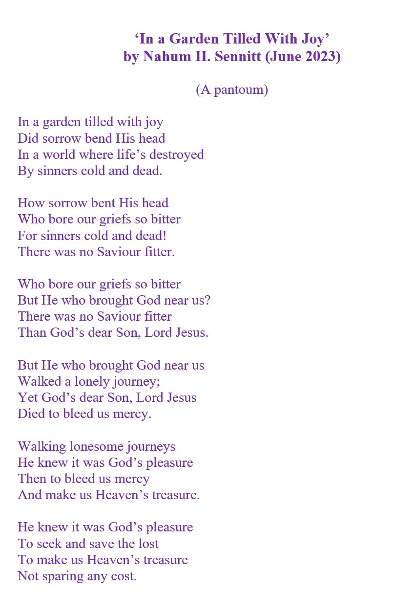 This is a pantoum that I wrote in June of 2023 named In a Garden Tilled with Joy. I loved writing it and it even brings tears to my eyes. May it bless you. Nahum.