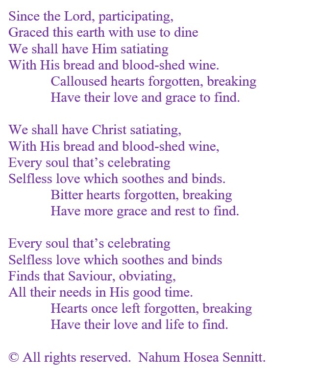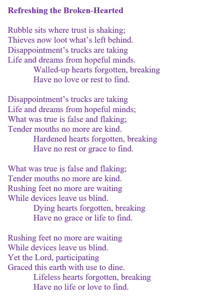 This poem is based on two Hebrew words that begin with the n-sounding letter, nun (נ); the first, a verb, is nafash, which means to refresh. (Its noun form, nefesh, is the Hebrew word for soul.) The second term, nishb’rei-lev means ‘broken-hearted’, a word that conveys the sense of someone being a victim of another person’s destructive malice. I shall let the poem speak for itself. May it bless you.