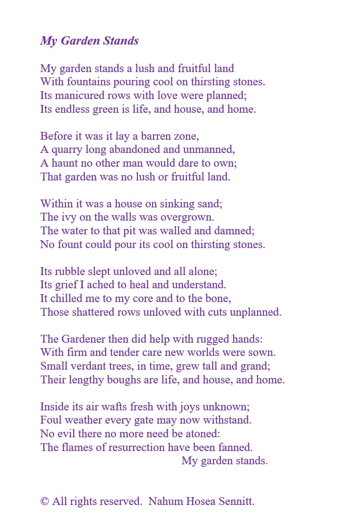 My Garden Stands (Poem) On 2024-10-122024-12-03 By NahumIn Nahum's Poetry, Rondeau Redoublé This is a poem that I wrote in the form of a rondeau redoublé. It’s called “My Garden Stands”. Share this: Click to share on X (Opens in new window) X Click to share on Facebook (Opens in new window) Facebook Like Loading... Related