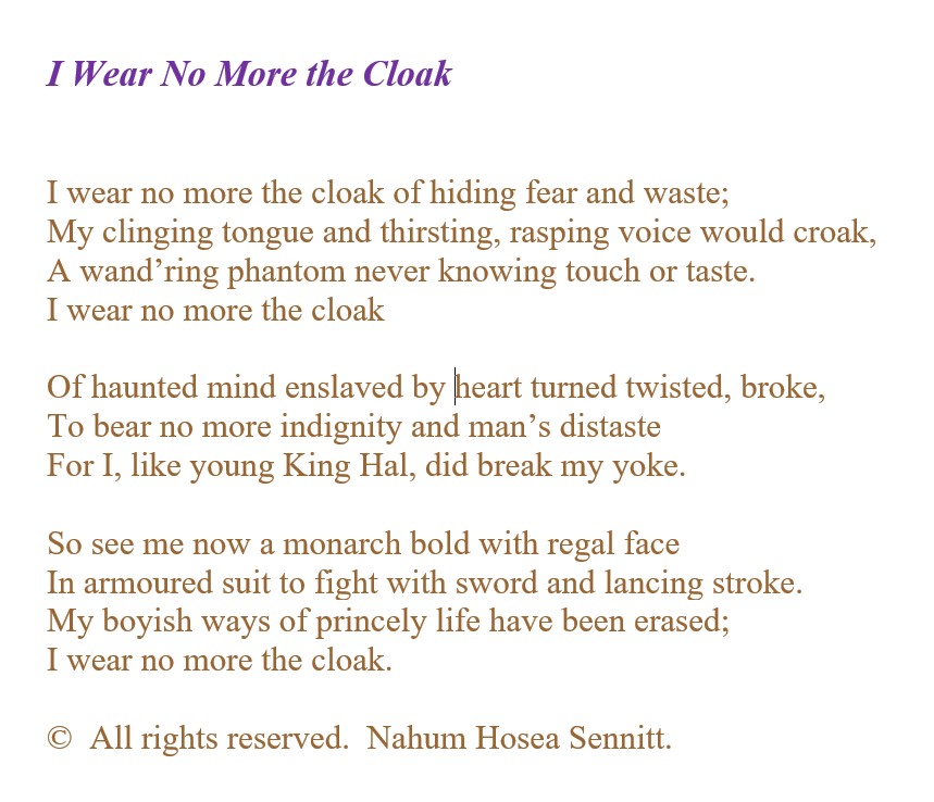 I Wear No More the Cloak of Childish Ways (Poem) On 2024-10-172024-12-03 By NahumIn Nahum's Poetry, Roundel I wrote today a short little poem, in the form of a French roundel, about leaving old ways behind me. Share this: Click to share on X (Opens in new window) X Click to share on Facebook (Opens in new window) Facebook Like Loading... Related