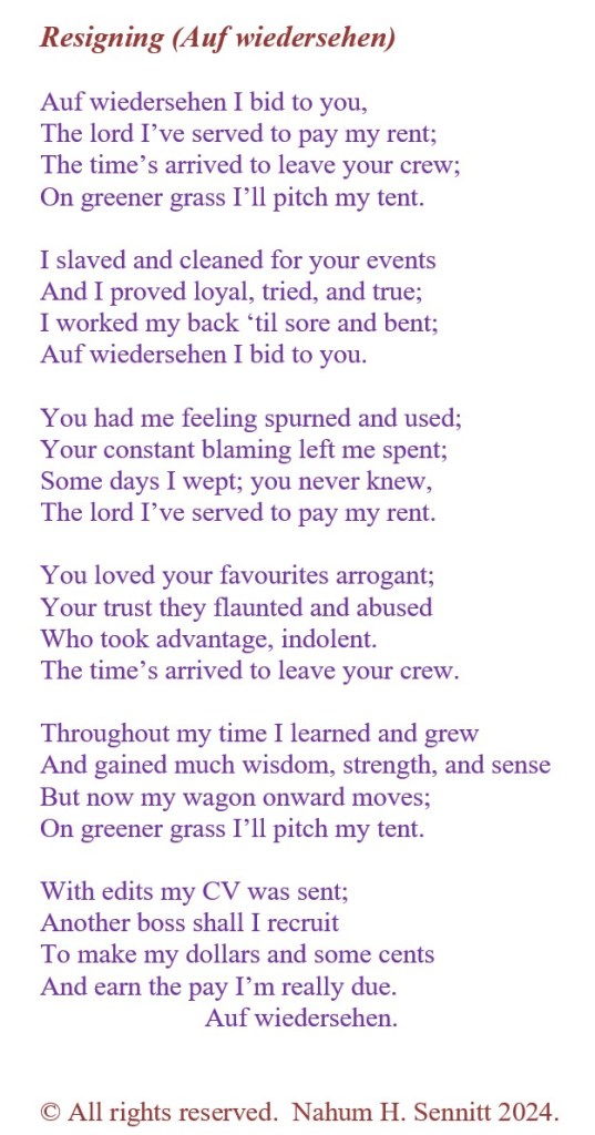 Here is a poem that I wrote about quitting work, which is something that I have recently had to do. It has been written in the form of a rondeau redoublé, where the four lines of Stanza 1 are repeated at the end of Stanzas 2-5. The poem then concludes with the first part of Line 1 (Auf Wiedersehen which, in German, means goodbye); this repeated phrase structures the entire poem. Enjoy! Nahum.