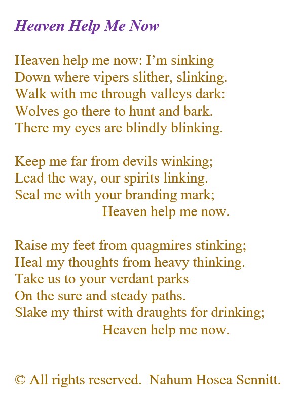 Heaven Help Me Now (Poem) On 2024-12-112024-12-12 By NahumIn Nahum's Poetry, Rondeau This is a prayer for God’s help in poetic form. It is in the form of a rondeau and written in trochaic tetrameter: Share this: Click to share on X (Opens in new window) X Click to share on Facebook (Opens in new window) Facebook Like Loading... Related