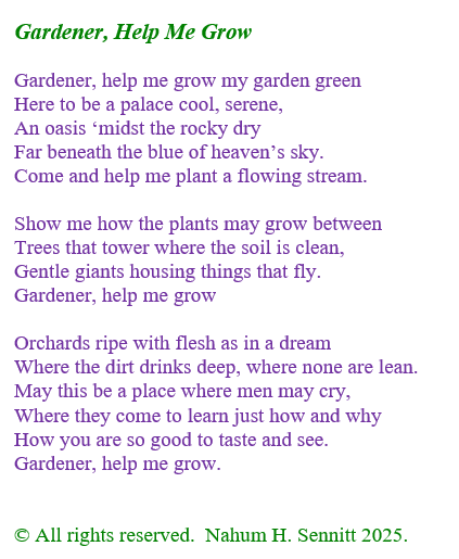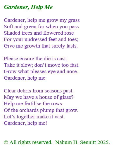 This week I wrote two poems named Gardener, Help Me Grow. Both have been written in the form of a rondeau where the rhyming scheme is R-aabba aabR aabbaR; The R is a repeated phrase, or a rentrement as the French call it, which states the theme of the poem; in this case it is “Gardener, Help Me [Grow]”.