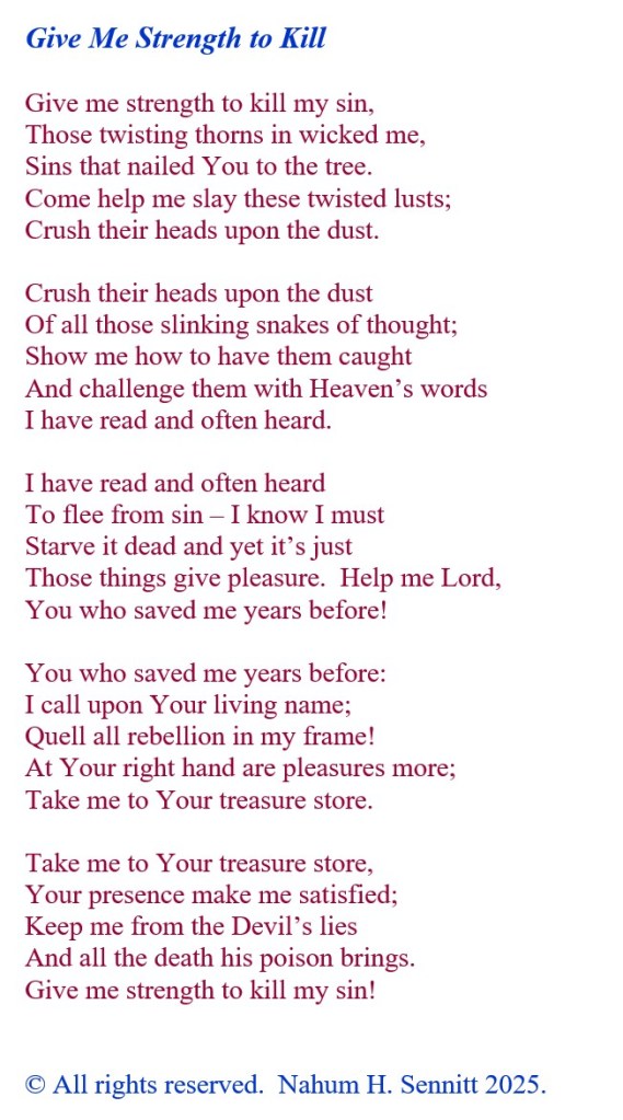Here is a poem that I wrote asking Jesus to help me kill my sin. It is written in the form of a cinquain chain, where the last line of each stanza forms the first line of the succeeding stanza. The first line of the poem is also its last. The rhyming pattern with each stanza is ABBCC. May it bless you, Nahum.