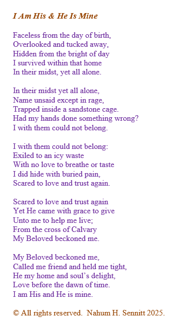 Today I wrote a poem that’s based on 2:16 of The Song of Solomon, “I am my Beloved’s and He is mine”. It reflects upon being painfully rejected by my family of origin, but taken in by Jesus. Upon writing it, I couldn’t stop weeping. It is written in the form of a cinquain chain, where the last line of each stanza forms the first line of the succeeding stanza. The first line of the poem is also its last. The rhyming pattern with each stanza is ABBCC. May it bless you, Nahum.