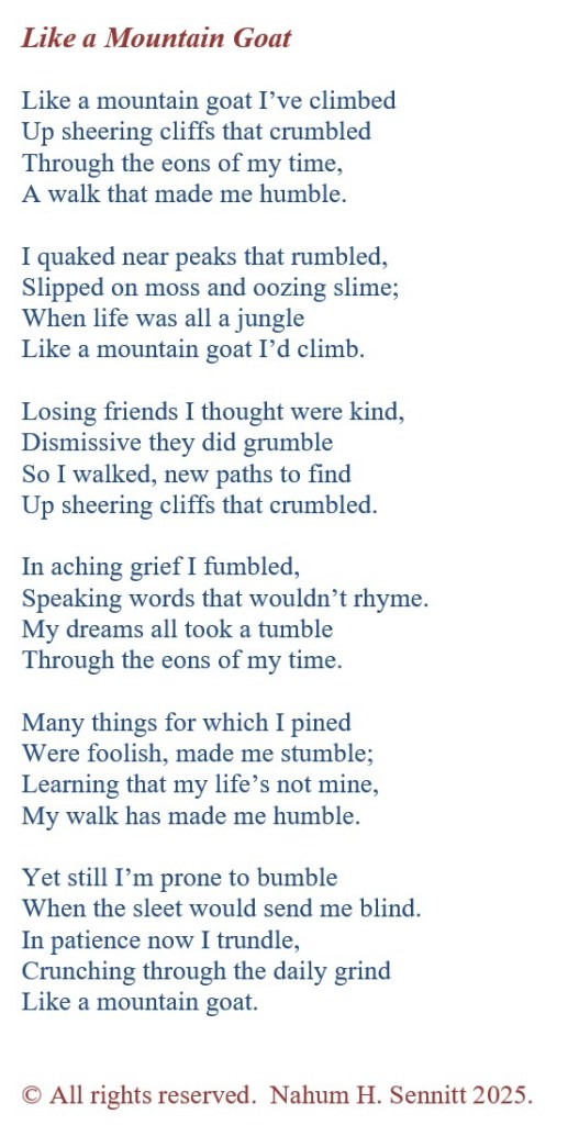 Below is a re-write of poem that I penned in 2023, which reflects on how slipperiness of life and the things that we trust, as well as survival. It has been written in the form of a rondeau redoublé, where the four lines of Stanza 1 are repeated at the end of Stanzas 2-5. The poem then concludes with the first part of Line 1 (Like a mountain goat); a repeated phrase that structures the entire poem. Each stanza rhymes with an alternating A-B-A-B/B-A-B-A pattern until the end; each line has 7 beats that alternate between trochees and iambs. Enjoy! Nahum.