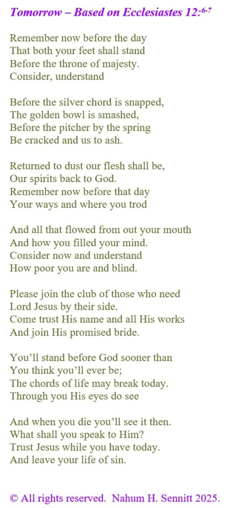 This is a poem that I wrote (in the form of a ballad) about the reality of eternity and how that makes life a serious thing. Each stanza has four lines with iambic stress. The 1st and 3rd lines each have eight beats and do not rhyme, while the 2nd and 4th lines each have 6 beats and do rhyme. God bless, Nahum.