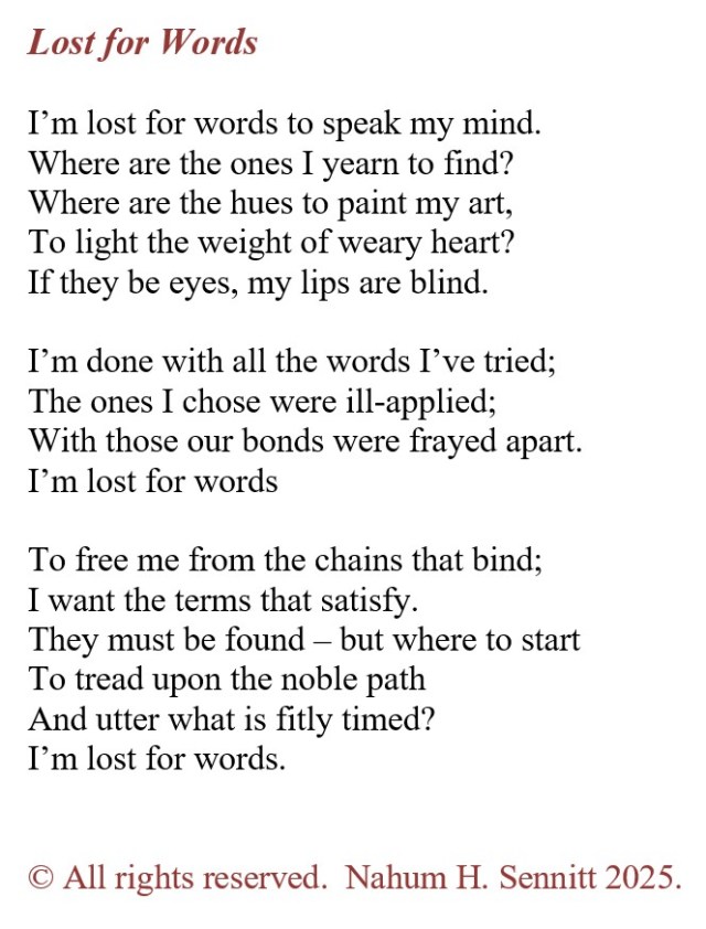Lost For Words (Poem) On 2025-11-10 By NahumIn Closed, Fixed Forms, Nahum's Poetry, Rondeau This poem that I wrote today is in the form of a rondeaux. God bless, Nahum. Share this: Click to share on X (Opens in new window) X Click to share on Facebook (Opens in new window) Facebook Like Loading... Related